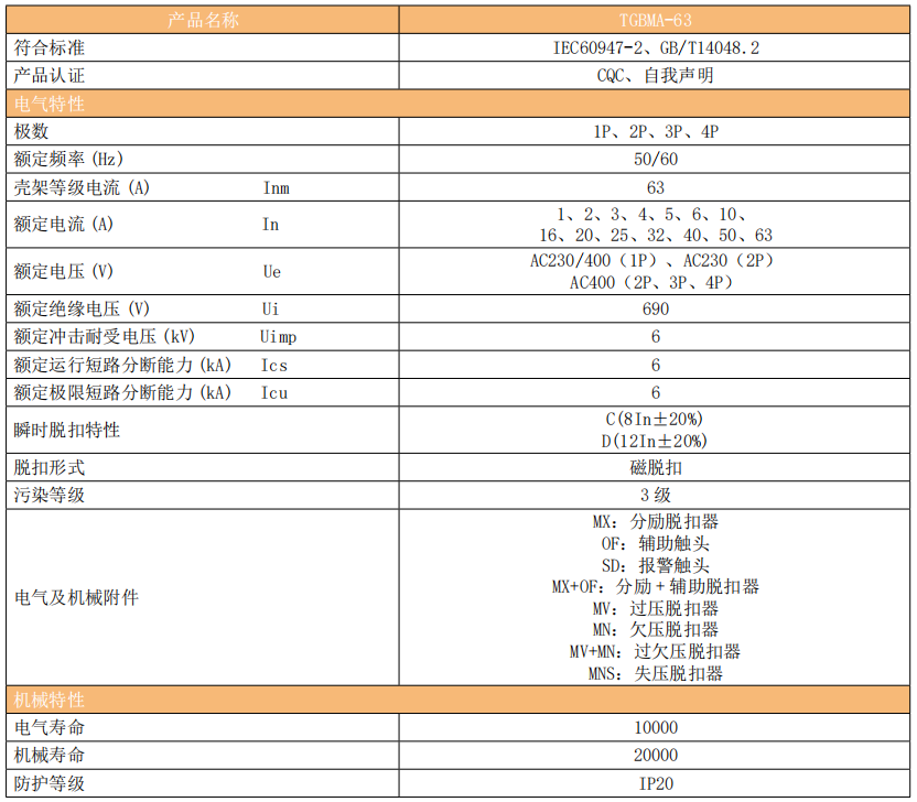TGBMA-63 单磁式断路器 ( 以下简称断路器 ) 主要适用于交流 50Hz/60Hz,额定电流1A至63A,额定电压230V或400V的配电网络中。适用于医疗IT配电系统、电机保护及建筑消防系统等领域的低压终端配电,作为短路保护开关,也可与热继电器或电机启动器配合使用,实现过载保护。